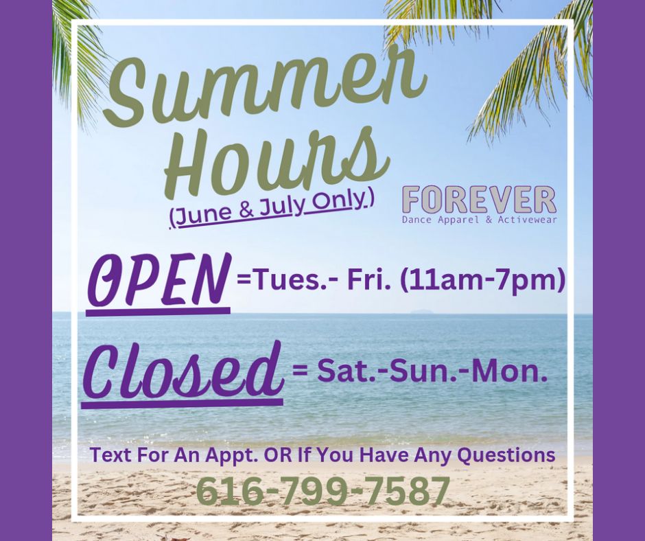 Summer Hours of 2025 ForeverDanceApparelJuly 2, 2025July 2, 2025 Feel free to text us with any questions. We hope you all have a Great Summer!